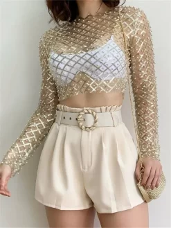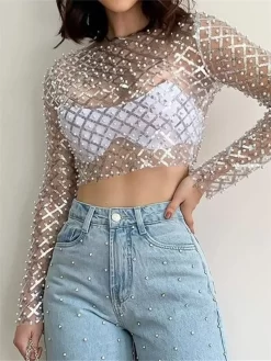 Women Pearl Sparkly Fishnet T-shirt Long Sleeve Mesh See Through Tee Tops 2024 Summer Fall Club Sexy Shirts Streetwear