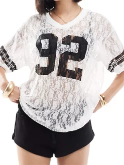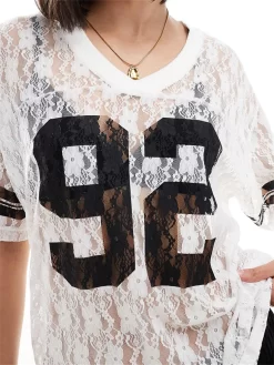 Women Summer Lace Football T-Shirt Casual Number Print See-Through V-Neck Short Sleeve Basic Tops for Streetwear
