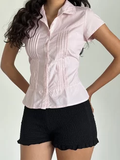 Women’s Summer Slim Fit Shirt Solid Color Short Sleeve Lapel Button Down Pleated Tops