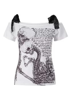 2024 Summer Women T-shirt Vintage Skull Print Gothic Grunge Y2K Tee Tops Off Shoulder Tie-up Short Sleeve Shirts Casual
